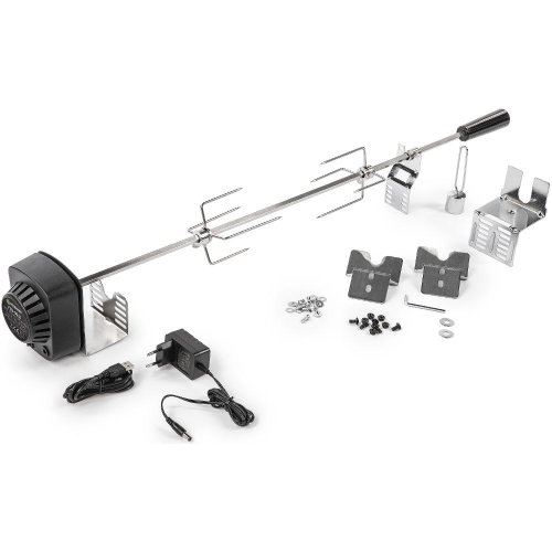 Grilovací jehla s motorem Motor: napětí 230 V, 50/60Hz Délka jehly: 80 cm Materiál: nerezová ocel 2x čtyřramenná vidlice 3x chromové držáky (U, Z) Délka kabelu: 125 cm Balení obsahuje vyvažovací závaží