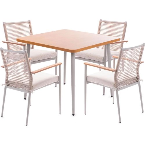 Luxusní set složený ze 4 ocelových křesel a stolu s deskou s nažehlenou fólií v designu dřeva Velikost stolu: 90 × 90 × 74 cm Velikost křesla 56 x 60 x 86 cm Součástí polyesterové podsedáky 5 cm Nevyžaduje žádnou zvláštní údržbu Určeno pro venkovní i vnitřní použití