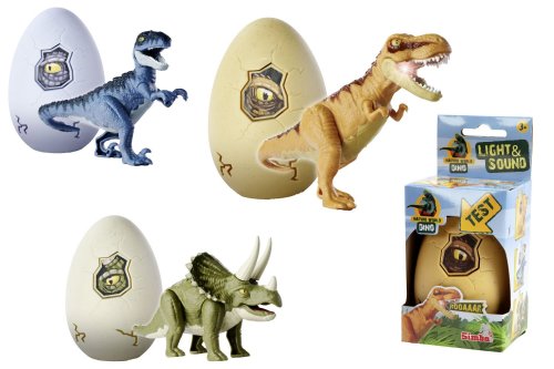 V každém vejci je schována figurka dinosaura o velikosti 14 cm, skládačka kostry dinosaura a návod. Dinosaurus svítí a vydává zvuky, 3 druhy - T-Rex, Velociraptor, Triceratops.