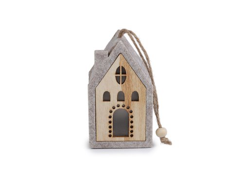 Svítící domeček je vyrobený z kombinace dřeva a pevného filcu. Svítí příjemným teplým světlem, které vypadá jako hvězdička. Díky poutku ho můžete pověsit na větvičky ve váze, na věnce i na vánoční stromeček. Baterie (CR2032) je součástí balení.