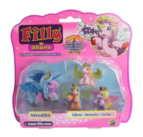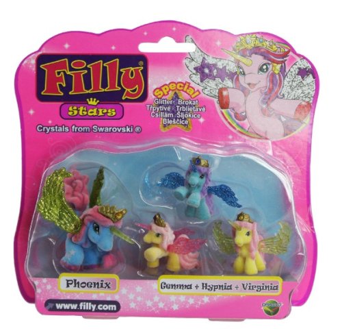 Z velmi vzdálené tajuplné země k vám přicválali noví Filly koníčci, koníčci Filly Stars. Mají kouzelné rohy a překrásná třpytivá křídla. Každý koník má zlatou korunku, kterou zdobí barevný křišťál. Doplňte svoji sbírku o Filly koníčka se třemi malými koníčky. Rozměry balení 18 x 17 x 5 cm. Vhodné pro děti od 3 let.