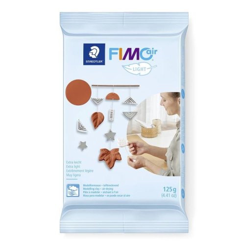 FIMO Air Light - lehčená samotvrdnoucí modelovací hmota z rodiny FIMO extrémně lehká modelovací hmota na vodní bázi patentově chráněné unikátní složení z 90 % obsahuje přírodní látky po vyschnutí nezmenšuje svůj objem ideální pro umělecké i hobby účely, stejně tak pro vzdělávací procesy ve školách, školkách a výtvarně zaměřených kroužcích velmi jemná konzistence tvrdnoucí na vzduchu (úplné vyschnutí po 24 hodinách) po vytvrdnutí je možné pilovat, vrtat, barvit, pískovat, lakovat a jinak povrchově upravovat dermatologicky testováno díky její měkké struktuře můžete vytvářet nejrůznější tvary i jemné detaily balení ve fólii zabraňuje vysychání hmoty Náš tip: Fimo air light lze barvit do různých odstínů akrylovými barvami. Stačí jen barvu kapnout do hmoty a hníst v gumových rukavicích, dokud se hmota neobarví.