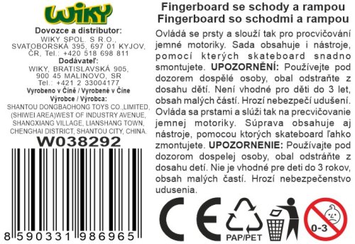 Fingerboard sada s rampou a schody. Rozměry rampy 28,5x20,5x10,5 cm, velikost fingerboardu 9,5 cm. Obsahuje: rampa, schody, 1x kompletní fingerboard.