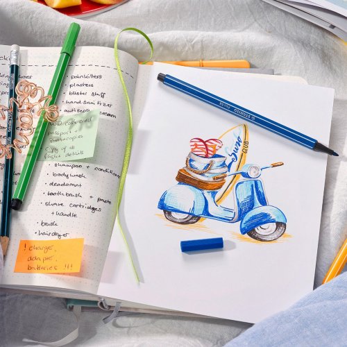 Vysoce kvalitní fix s vláknovým hrotem a výraznou intenzitou barev pro silné čáry a velké plochy. Štíhlé plastové tělo a prodyšný uzávěr v barvě náplně.