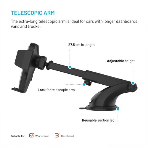 Silikonové prvky pro ochranu telefonu Teleskopické rameno s nastavitelnou výškou a délkou 10,8 -16,8 cm Přísavný podstavec pro připevnění na čelní sklo či palubní desku Znovupoužitelná přísavná základna se silnou přilnavostí 360° otočný kloub pro nastavení ideálního úhlu Odnímatelné úchyty pro nabíjecí kabel na zadní straně držáku Ponechává volný přístup k nabíjecímu konektoru
