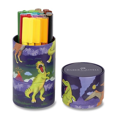 Souprava 20 kusů fixů různých barev se spojovacími klipy v plechové dóze s motivem dinosaurů.