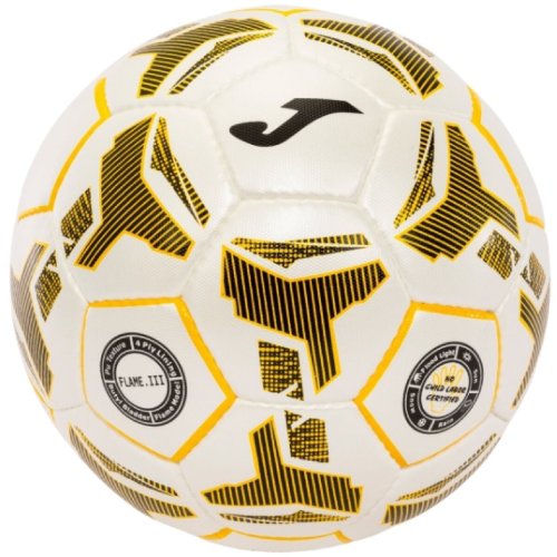 Fotbalový míč JOMA Flame III je navržený pro hru na umělém i přírodním trávníku. Je vhodný pro trénink i zápasy hráčů všech výkonnostních úrovní. Lepený míč velikosti č. 5 je tvořený ze 32 panelů vyrobených z kombinace materiálů (42% Viscose, 38% Polyurethane, 13% Latex, 7% Nylon). Díky jeho kvalitnímu zpracování nabízí skvělé vlastnosti i při použití na mokrém povrchu, drží si svůj tvar a hmotnost. Jeho speciální povrch a vnitřní butylová vzdušnice zajišťují lepší trajektorii letu. Upozornění: míče nafukujte vždy pouze pomocí navlhčené jehly na doporučený tlak (uvedeno na míči), jinak hrozí jeho poškození. Tabulka velikostí míče velikost obvod věk uživatele hmotnost 5 68 – 70 cm starší 12 let 410 g – 450 g 4 64 – 66 cm 8 – 12 let 350 g – 390 g 3 58 – 61 cm do 8 let 310 g – 340 g