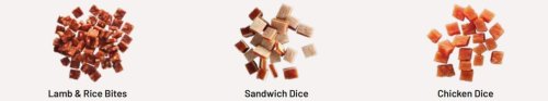Sendvičové kostky: kuřecí 56,7 %, treska 15,6 %, glycerin 12 %, škrob 10 %, arašídový protein 1,8 %, hrachový protein 1,7 %, sorbitol 2 %, sůl 0,2 %. Analytické složky: vlhkost 23 %, hrubý protein 23 %, hrubý popel 8 %, hrubá vláknina 3 %, hrubé tuky 0,5 %, chlorid sodný 0,2 %.