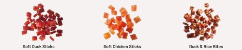 Měkké kachní tyčinky: kachní 83,1 %, glycerin 12,9 %, škrob 2,4 %, sójový protein 1,2 %, sůl 0,4 %. Analytické složky: hrubý protein 35 %, vlhkost 23 %, hrubý popel 6 %, hrubá vláknina 3 %, hrubé tuky 0,5 %, chlorid sodný 0,4 %.