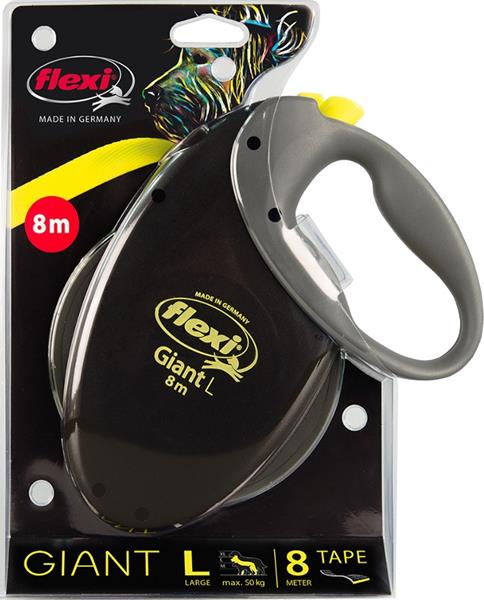 Něco mimořádného pro velké psy. Robustní vodítko Giant je snadno ovladatelné a měkká rukojeť se krásně drží. Neonový barevný pásek zajišťuje lepší viditelnost i z velké dálky. Vyzkoušený a osvědčený mechanismus v masivním pouzdře zastaví pouhým stisknutím tlačítka i nejsilnější pohyb vpřed. Vodítko prochází před expedicí mnoha kontrolami kvality. Rodinná firma flexi vyrábí výhradně na území Německa. V závodě v Bargteheide u Hamburgu vzniká vše, počínaje návrhem až po výrobu vysoce kvalitních vodítek – Made in Germany. Firma flexi je vynálezcem samonavíjecího vodítka a jedničkou na světovém trhu, exportuje do více než 90 zemí světa. Originální samonavíjecí vodítka flexi se vyznačují patentovaným, po technické stránce nejmodernějším pružinovým systémem a komfortním ovládáním. Jsou vyráběna z vysoce kvalitních materiálů, exkluzivně manuálně zpracovaná a sestavená. Vodítka prochází před expedicí mnoha kontrolami kvality. Velikost: L – vhodné pro psy o hmotnosti do 50 kg. Typ vodítka: Navíjecí – pásek. Délka pásku/lanka: 8 m Barva: černá