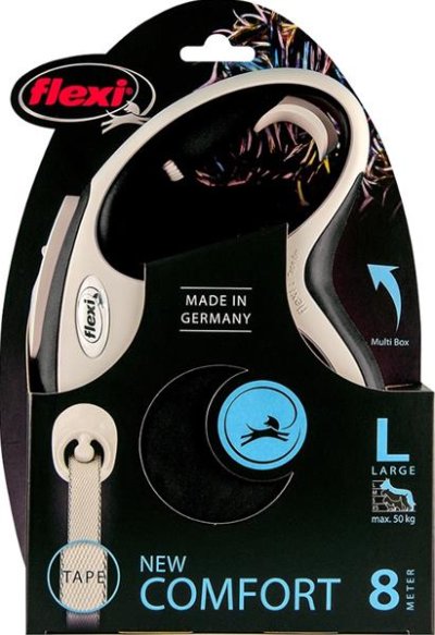 Dokonale navržené dvoubarevné vodítko Vás upoutá na první pohled. New Comfort nabízí všechny funkce, které potřebujete a proto si ho brzy zamilujete! Vylepšený brzdový systém s krátkým zdvihem umožňuje více kontroly, ergonomické držadlo je nastavitelné dle velikosti ruky (od velikosti M). Lze přidat i Multi Box pro ukládání pamlsků či sáčků (od velikosti S). Rodinná firma flexi vyrábí výhradně na území Německa. V závodě v Bargteheide u Hamburgu vzniká vše, počínaje návrhem až po výrobu vysoce kvalitních vodítek – Made in Germany. Firma flexi je vynálezcem samonavíjecího vodítka a jedničkou na světovém trhu, exportuje do více než 90 zemí světa. Originální samonavíjecí vodítka flexi se vyznačují patentovaným, po technické stránce nejmodernějším pružinovým systémem a komfortním ovládáním. Jsou vyráběna z vysoce kvalitních materiálů, exkluzivně manuálně zpracovaná a sestavená. Vodítka prochází před expedicí mnoha kontrolami kvality. Velikost: L – vhodné pro psy o hmotnosti do 60 kg. Typ vodítka: Navíjecí – pásek. Délka pásku/lanka: 8 m Barva: černá