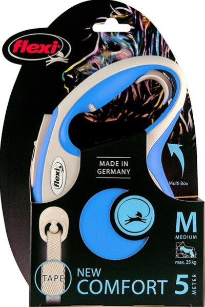 Dokonale navržené dvoubarevné vodítko Vás upoutá na první pohled. New Comfort nabízí všechny funkce, které potřebujete a proto si ho brzy zamilujete! Vylepšený brzdový systém s krátkým zdvihem umožňuje více kontroly, ergonomické držadlo je nastavitelné dle velikosti ruky (od velikosti M). Lze přidat i Multi Box pro ukládání pamlsků či sáčků (od velikosti S). Rodinná firma flexi vyrábí výhradně na území Německa. V závodě v Bargteheide u Hamburgu vzniká vše, počínaje návrhem až po výrobu vysoce kvalitních vodítek – Made in Germany. Firma flexi je vynálezcem samonavíjecího vodítka a jedničkou na světovém trhu, exportuje do více než 90 zemí světa. Originální samonavíjecí vodítka flexi se vyznačují patentovaným, po technické stránce nejmodernějším pružinovým systémem a komfortním ovládáním. Jsou vyráběna z vysoce kvalitních materiálů, exkluzivně manuálně zpracovaná a sestavená. Vodítka prochází před expedicí mnoha kontrolami kvality. Velikost: M – vhodné pro psy o hmotnosti do 25 kg. Typ vodítka: Navíjecí – pásek. Délka pásku/lanka: 5 m Barva: modrá