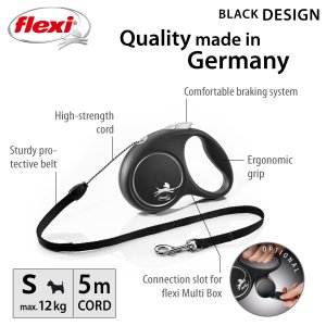 Černá je zpět! Vodítko z řady flexi® Black Design upoutá pozornost na první pohled. Výrazné barvy elegantně kontrastují s černým pouzdrem. Moderní design lze zároveň kombinovat s praktickými doplňky flexi®.