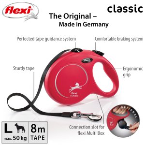 Vodítka flexi® classic nabízí pohodlný úchop, odolný navíjecí systém i kvalitní, bezpečný a intuitivní brzdný systém, který ve zlomku vteřiny zastaví pohyb psa. Pro snadné upevnění vodítka k obojku nebo postroji je vodítko opatřeno chromovanou karabinou. Samozřejmostí je zdokonalený výstup pásku, který zajišťuje manipulaci v libovolném směru bez zasekávání - potvrzeno nesčetnými testy.
