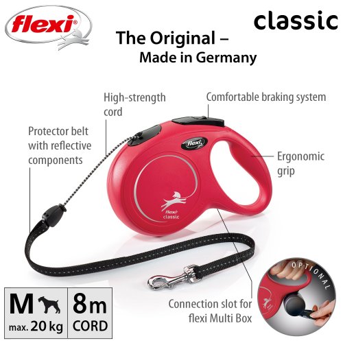 Vodítka flexi® Classic nabízí pohodlný úchop, odolný navíjecí systém i kvalitní, bezpečný a intuitivní brzdový systém, který ve zlomku vteřiny zastaví pohyb psa. Pro snadné upevnění vodítka k obojku nebo postroji je vodítko opatřeno chromovanou karabinou.