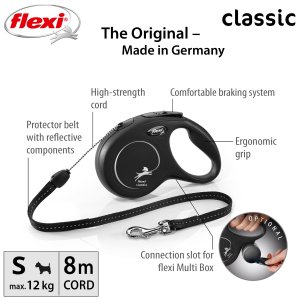 Vodítka flexi® classic nabízí pohodlný úchop, odolný navíjecí systém i kvalitní, bezpečný a intuitivní brzdný systém, který ve zlomku vteřiny zastaví pohyb psa. Pro snadné upevnění vodítka k obojku nebo postroji je vodítko opatřeno chromovanou karabinou. Moderní design lze zároveň kombinovat s praktickými doplňky flexi® Multi Box a flexi® LED osvětlením (kromě velikosti XS).
