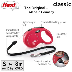 Vodítka flexi® classic nabízí pohodlný úchop, odolný navíjecí systém i kvalitní, bezpečný a intuitivní brzdný systém, který ve zlomku vteřiny zastaví pohyb psa. Pro snadné upevnění vodítka k obojku nebo postroji je vodítko opatřeno chromovanou karabinou. Moderní design lze zároveň kombinovat s praktickými doplňky flexi® Multi Box a flexi® LED osvětlením (kromě velikosti XS).