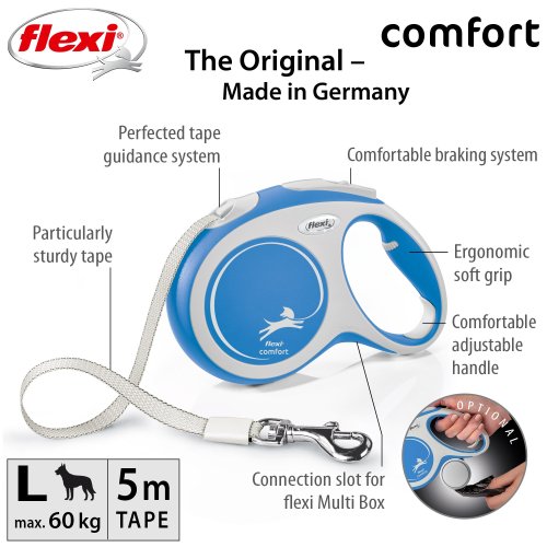 Pohodlné a díky svému dokonale sladěnému designu i unikátní - to je vodítko flexi® Comfort, které nabízí Vašemu čtyřnohému příteli vše, co psi milují: pohyb, pohyb a ještě jednou pohyb! Vás jistě potěší extra pohodlná, měkká rukojeť (ve velikosti M a L je navíc nastavitelná) i zdokonalený výstup a vedení pásku všemi směry bez zasekávání. Na každé procházce oceníte i bezpečný a intuitivní brzdový systém, který ve zlomku vteřiny zastaví pohyb psa. Pro snadné upevnění vodítka k obojku nebo postroji je vodítko opatřeno kvalitní chromovanou karabinou.