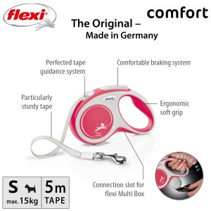 Pohodlné a díky svému dokonale sladěnému designu i unikátní - to je vodítko flexi® comfort, které nabízí Vašemu čtyřnohému příteli vše, co psi milují: pohyb, pohyb a ještě jednou pohyb! Vás jistě potěší extra pohodlná, měkká rukojeť (ve velikosti M a L je navíc nastavitelná) i zdokonalený výstup a vedení pásku všemi směry bez zasekávání. Na každé procházce oceníte i bezpečný a intuitivní brzdný systém, který ve zlomku vteřiny zastaví pohyb pásku. Pro snadné upevnění vodítka k obojku nebo postroji je vodítko opatřeno kvalitní chromovanou karabinou. Kompatibilní s praktickými doplňky flexi® Multi Box a flexi® LED osvětlením (platí pro velikost S, M a L).