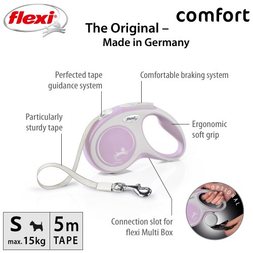 Pohodlné a díky svému dokonale sladěnému designu i unikátní - to je vodítko flexi® Comfort, které nabízí Vašemu čtyřnohému příteli vše, co psi milují: pohyb, pohyb a ještě jednou pohyb! Vás jistě potěší extra pohodlná, měkká rukojeť (ve velikosti M a L je navíc nastavitelná) i zdokonalený výstup a vedení pásku všemi směry bez zasekávání. Na každé procházce oceníte i bezpečný a intuitivní brzdový systém, který ve zlomku vteřiny zastaví pohyb psa. Pro snadné upevnění vodítka k obojku nebo postroji je vodítko opatřeno kvalitní chromovanou karabinou.