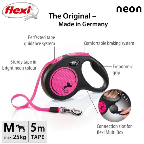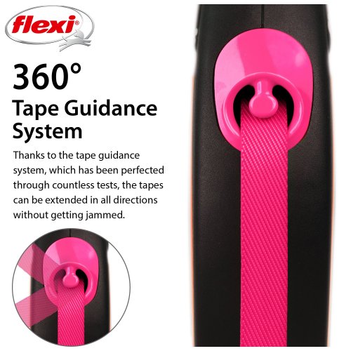 Flexi® Neon zároveň nabízí i nesčetnými testy zdokonalený výstup a vedení pásku všemi směry bez zasekávání. S délkou 5 m poskytuje Vašemu parťákovi potřebnou volnost pohybu.