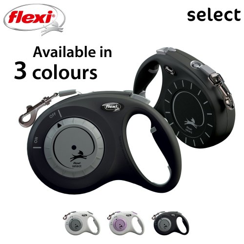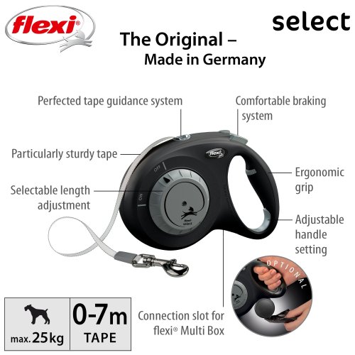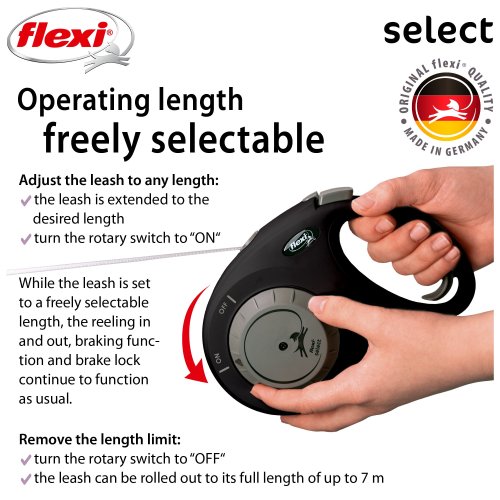 První samonavíjecí vodítko flexi®, u kterého lze maximální délku volně nastavit mezi 0 a 7 metry, díky čemuž je flexi® Select ideální pro procházky ve městě i v lese.