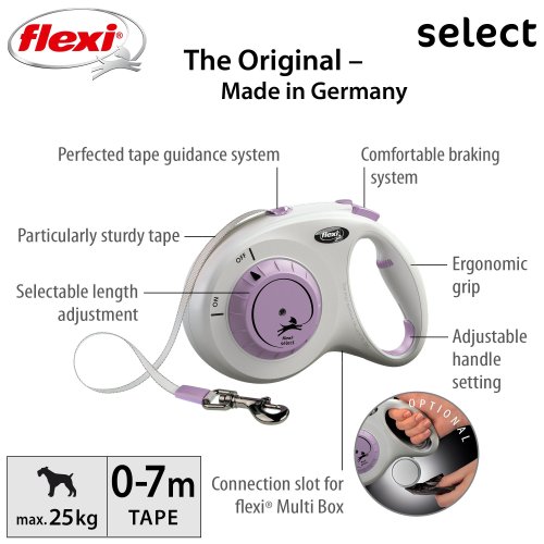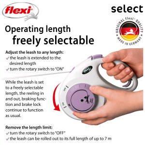 První samonavíjecí vodítko flexi®, u kterého lze maximální délku volně nastavit mezi 0 a 7 metry, díky čemuž je flexi® Select ideální pro procházky ve městě i v lese.