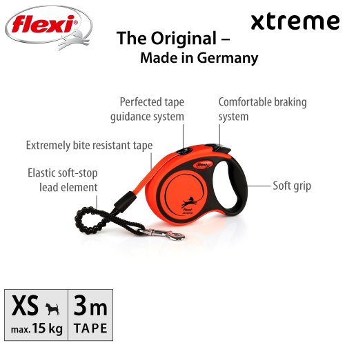 Extrémně odolné vodítko nejen pro milovníky adrenalinu. Ať už je Váš čtyřnohý parťák obzvlášť aktivní nebo vás čekají dobrodružné výzvy, flexi® Xtreme nabízí ještě větší bezpečnost s extrémně odolným páskem flexi® X11 a více pohodlí díky integrovanému tlumiči Soft-Stop. K většímu bezpečí připívá i výrazná barva, která je snadno rozpoznatelná z dálky i za soumraku. Protože čím delší je vodítko, tím důležitější je, aby bylo dobře viditelné. Pro Vaše pohodlí disponuje flexi® Xtreme ve velikostech M a L nastavitelnou rukojetí. Rukojeť lze přizpůsobit velikosti Vaší ruky pro pevný úchop na každé procházce. Samozřejmostí je i nesčetnými testy zdokonalený výstup a vedení pásku všemi směry bez zasekávání.