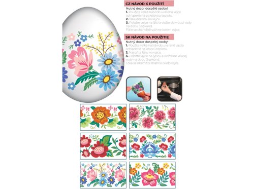 Fólie jsou vhodné pro snadné a rychlé zdobení velikonočních vajec. Stačí fólii navléknout na vejce a krátce ponořit do horké vody. Tradiční motivy dodají kraslicím autentický vzhled a hodí se pro klasickou velikonoční výzdobu. Zboží je dodáváno v mixu. Doručované zboží je vybíráno náhodně a nelze vybrat konkrétní provedení.