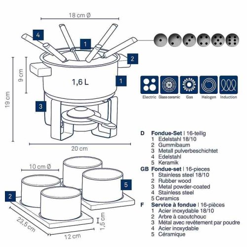 Praktické použití: Vhodné na indukci a obsahuje vše potřebné pro přípravu fondue.