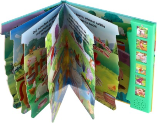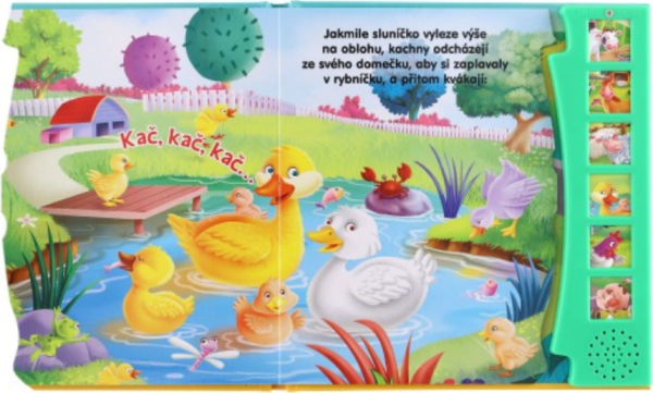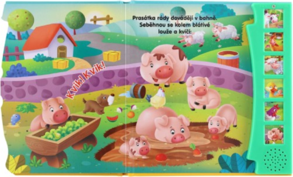 Zmáčkněte, prohlížejte obrázky a poslouchejte! Knížka seznámí děti se zvířátky, která žijí na farmě. Stisknou tlačítko a mohou si poslechnout jak dělá kravička, kůň, slepice, prasátko a další zvířátka. Kniha obsahuje baterie.