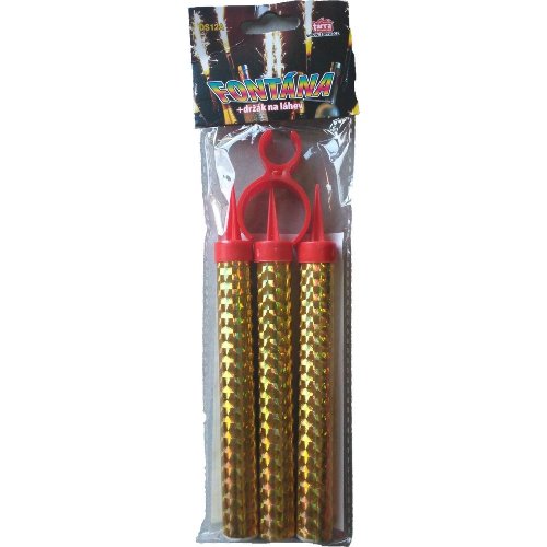 Jedno balení obsahuje 3 kusy zlaté párty fontány o délce 12 cm s držákem na láhev. Žádná párty se neobejde bez těchto párty fontán! Párty fontána dokonale nahradí svíčky na dortu. Pomocí plastového podstavce snadno a bezpečně zapíchnete do dortu. Díky originálními držáku na láhev, fontánu můžete snadno umístit pomocí držáku na hrdlo láhve. Fontánka po zapálení prská jako prskavka což vytváří nezapomenutelný efekt pro předávání sladké dobroty oslavenci. Délka trvání efeku: cca 40 sec. CLP – Třída nebezpečnosti. H204 Nebezpečí požáru nebo zasažení částicemi. P210 Chraňte před teplem, horkými povrchy, jiskrami, otevřeným ohněm a jinými zdroji zapálení. Zákaz kouření. P250 Nevystavujte obrušování/nárazům/tření. P280 Používejte ochranné rukavice/ochranný oděv/ochranné brýle. P370 + P380 + P375 V případě požáru: Vykliďte prostor. Kvůli nebezpečí výbuchu haste z dostatečné vzdálenosti. P372 Nebezpečí výbuchu. P401 Skladujte pouze v původním obalu. P501 Odstraňte obsah/obal předáním k likvidaci oprávněné osobě. CS – VAROVÁNÍ Pyrotechnický výrobek tř.1.4G UN 0336.