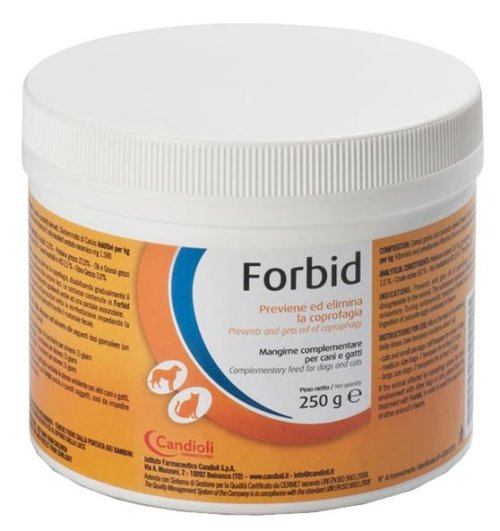 Forbid – nutriční doplněk pro psy a kočky k prevenci a odstranění koprofágie (pojídání výkalů). Indikace: Forbid obsahuje specifické rostlinné proteinové extrakty, které způsobí extrémně nepříjemnou chuť feces (výkalů). Podle nedávných klinických studií je koprofágie zapříčiněná poruchou chování zvířete a ne specifickým deficitem v potravě, jak se předpokládalo. Terapeutický přístup zde musíme směrovat ke změně chovaní zvířete tím, že se mu feces stane nepříjemným. Substance obsažené ve forbidu učiní feces pro zvíře naprosto odporné. 85 % štěňat postižených touto poruchou chování přestalo po léčbě Forbidem koprofágií trpět. V průběhu antiparazitární léčby zabraňuje Forbid pozření trusu a tím reinfestaci parazitárních vajíček obsažených ve feces. Složení: Cerálie, minerální látky a vitaminy - intergrace na kg: vitamin E (90 % alfatokocoferol) 1 500 mg. Dávkování: Namíchejte s krmivem a podávejte nejméně 15 dní v následujících dávkách: Kočky a malí psi – polovina čajové lžičky. Střední a velcí psi – 1 čajová lžička.
