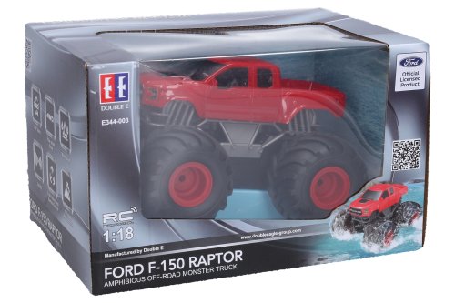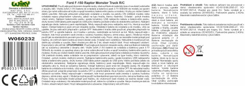 Ford F-150 Raptor Monster Truck plavací červený RC na dálkové ovládání. Rozměry 20,2x17,2x13,2 cm. Frekvence 2.4GHz. Bateriový pack 3.7V 500mAh do auta součástí, 2xAA do ovladače nejsou součástí. Tlačítko (přepínač) ON/OFF na spodní straně auta. Ovladač - pohyb dopředu a dozadu, otáčení vlevo a vpravo, přepínač ON/OFF, 2 tlačítka pro trimování kol. Nabíjení 3 h.