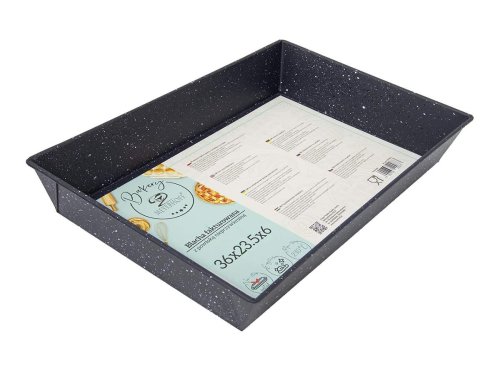 Vyrobeno ze zdravotně nezávadného plechu s nepřilnavou povrchovou úpravou mramor. Rozměry 36 x 23.5 x 6 cm. Forma na pečení koláčů, buchet, korpusů dortu apod. EAN 5902738200873