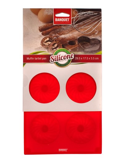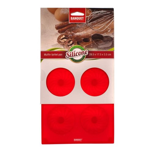 rozměry: 29,5 x 17,5 x 3,5 cm horní průměr jedné bábovky: 6,5 cm dolní průměr jedné bábovky: 5 cm materiál: silikon barva: červená