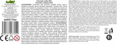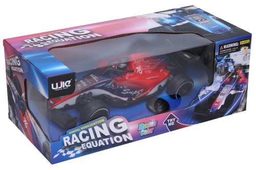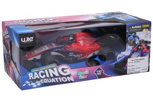 Formule svítící RC na dálkové ovládání. Rozměry 25,5x11,7x7,3 cm. Frekvence 27MHz. Světelné efekty povrchu formule. 3xAA baterie do formule, 2xAA do ovladače nejsou součástí. Try Me tlačítko pro světelné efekty v obalu - 3xAG13 baterie (neměnitelné) součástí. Při vybalování nutno odpojit Try Me kabel z formule. Rychlost 10 km/h. Dosah až 20 m. Přepínač ON/OFF na spodní straně formule.