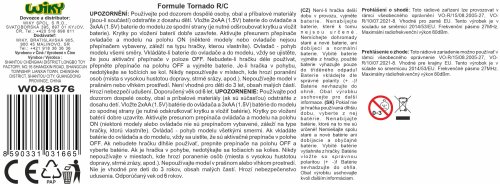Formule Tornado RC na dálkové ovládání. Rozměry 19,5x8x4,5 cm. Frekvence 27MHz. Světelné efekty. 3xAA baterie do formule, 2xAA do ovladače nejsou součástí. Přepínač ON/OFF na spodní straně formule. 2 varianty - červená, šedá.