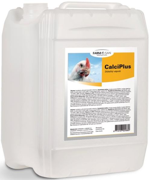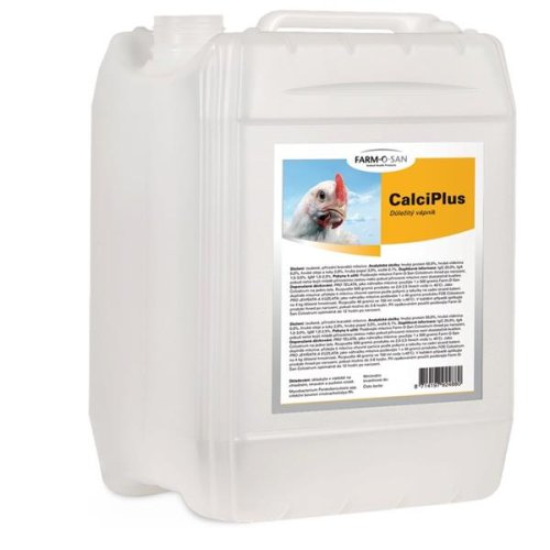 Problém: Vápník je velmi důležitý prvek ve výživě zvířat. Jeho nedostatek se u nosnic projevuje zhoršenou kvalitou skořápky a u rychle rostoucích kuřat špatným růstem a vývojem kostí, které se mohou projevit deformací a zvýšenou lámavostí (rachitis). U dospělé drůbeže nedostatečná hladina vápníku v krmné dávce vede k demineralizaci kostí, což způsobuje jejich měknutí (osteomalacie) nebo řídnutí (osteoporóza). Všechny tyto stavy značně ovlivňují užitkovost. Složení v 1 ml: vápník 99 mg, vitamin D3 320 m.j. Způsob aplikace: Calciplus se přidává do pitné vody po dobu zvýšené potřeby vápníku. Vzhledem k vyššímu obsahu doplňkových látek v porovnání s kompletním krmivem, nesmí dávka tohoto doplňkového krmiva překročit 1 % denní krmné dávky. Dávkování: Drůbež: 750 - 1500 ml / 1000 l pitné vody