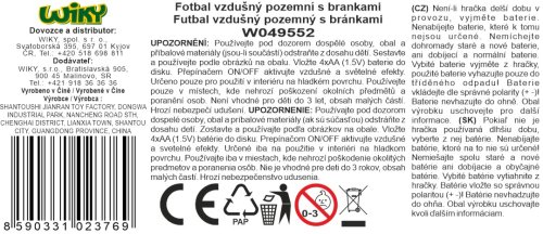 Fotbal vzdušný air football. Rozměry disku 18x6x18 cm. Obsahuje 2 branky. Vydává světelné efekty, aktivace ON/OFF přepínačem na spodní straně. Baterie 4xAA 1,5V, nejsou součástí balení. Schéma na sestavení branky na obalu.