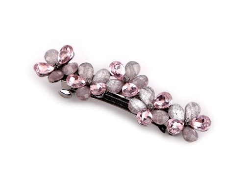 Francouzská spona zdobená akrylátovými broušenými květy luxusně ozdobí váš účes. Má nádherný lesk, který přitahuje pozornost. Luxusně ozdobí slavnostní účes. Ať už máte jemné prameny nebo husté lokny, touto sponou snadno sepnete vlasy do copu nebo vytvoříte elegantní drdol, který bude vypadat, jako kdyby ho vytvořil profesionál. Spona má velmi kvalitní celokovové provedení. Zacvakávací mechanismus je pevný. Délka části pro vlasy je 4 cm.