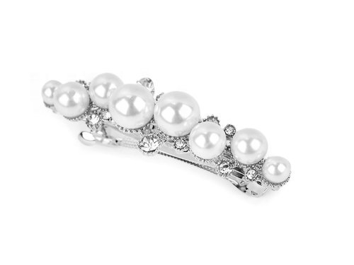 Francouzská spona s perlami dokonale ozdobí slavnostní účes. Má velmi kvalitní celokovové provedení. Zacvakávací mechanismus je pevný. Spona č.1 je zdobená voskovanými perlami a broušenými kamínky, které se oslnivě třpytí. Délku části pro vlasy má 3,5 cm. Spona č. 2 nemá broušené kamínky. Délku části pro vlasy má 4,5 cm. Spona č. 3 nemá broušené kamínky. Délku části pro vlasy má 5 cm.
