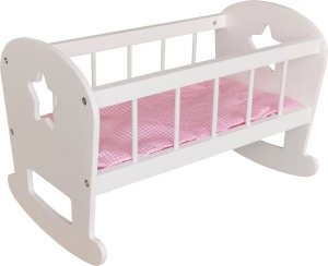 Dřevěná kolébka pro panenky, plyšová zvířátka a jiné hračky až do 40 cm . Kolébka je vyrobena z kvalitního dřeva a má bílou barvu. Součástí balení je také peřinka a polštářek pro panenku. Rozměry kolébky jsou 46 x 33 x 32,7 cm. Poznámka: Dodáváno v kartonové krabici v rozloženém stavu.