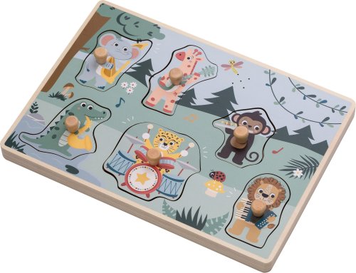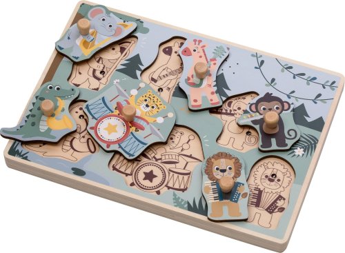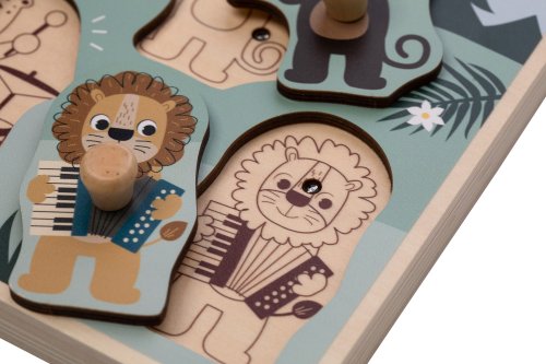 Dřevěné zvukové puzzle s obrázky zvířátek z džungle. Veselá zvířátka z džungle vydávají po vložení zvuky. Děti se naučí rozpoznávat zvířátka i jejich zvuky. Toto dřevěné puzzle podporuje představivost, stimuluje smysly a pomáhá rozvíjet jemnou motoriku a koordinaci oko-ruka. Vlastnosti: