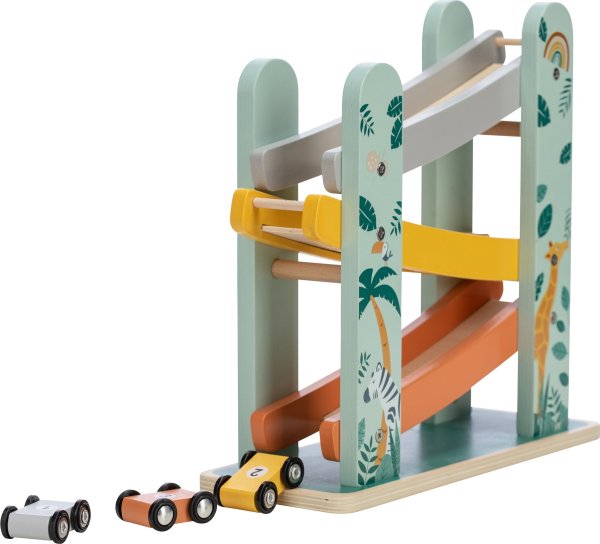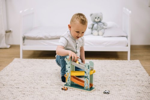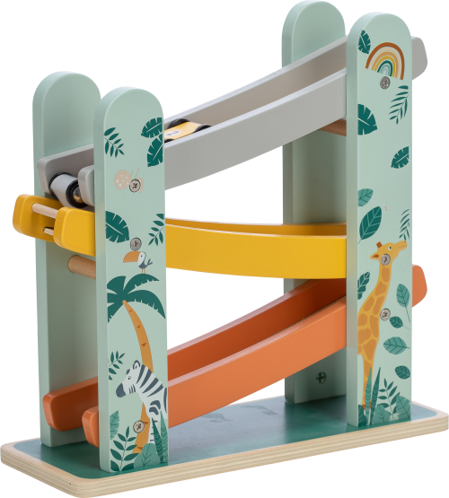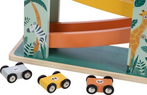 Na značky, připravit, start! Tato dřevěná kaskádová závodní dráha nabízí prostor pro změření rychlosti 3 autíček. Z jednoho patra na druhé, autíčka dělají přemety a jen koukat na ně je zábavné.