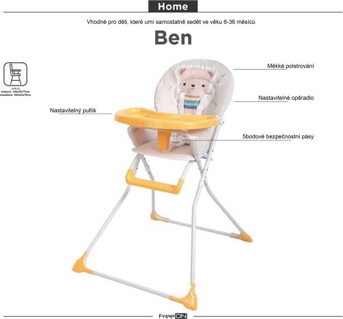 Vysokou židličku Ben s polstrováním pro pohodlnější krmení a hraní lze zcela přispůsobit potřebám dítěte díky nastavitelnému opěradlu a výšce sedátka. Vlastnosti: