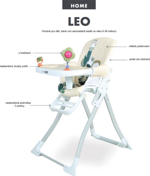Pohodlná vysoká židlička Leo uspokojí všechny potřeby moderního rodiče - snadno se čistí, je z kvalitních materiálů a má dvě barevné dekorativní hračky, které dítě zabaví. S touto židličkou skončí každá lžička v puse. Vlastnosti: