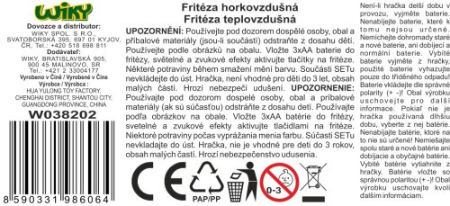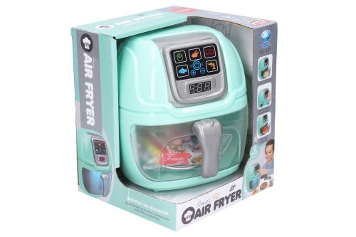 Fritéza horkovzdušná s efekty. Rozměry 17x16,5x19 cm. Světelné i zvukové efekty. Po zavření se rozsvítí světlo a displej. Tlačítky lze zvolit dobu smažení. Po zapnutí se rozsvítí modré světlo. Potraviny ve fritéze změní při smažení barvu. Obsahuje: fritézu, 2 nugety, 3 hranolky, krabičku těstovin, 2x talířek a kleštičky. 3xAA baterie součástí.