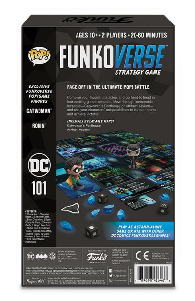 Sběratelská strategická desková hra s figarkami Funko ze světa DC! Ve hře Funkoverse si hráči zahrají za své oblíbené postavy z filmů DC! V každém hracím kole si hráč vybere jednu postavu, se kterou může zahrát 2 základní akce nebo použít například jednu ze speciálních akcí dané postavy. Hráči musí vymyslet tu nejlepší strategii, jak nakombinovat postavy, jejich speciální schopnosti a předměty, aby získali co nejvíce bodů a vyhráli! Hra obsahuje figurky: Catwoman, Robin Dále obsahuje 2 herní plány: Arkham Asylum a Catwoman penthouse. Hra lze hrát samostatně nebo se dá použít jako rožšíření k základní verzi. Hra je v anglickém jazyce.