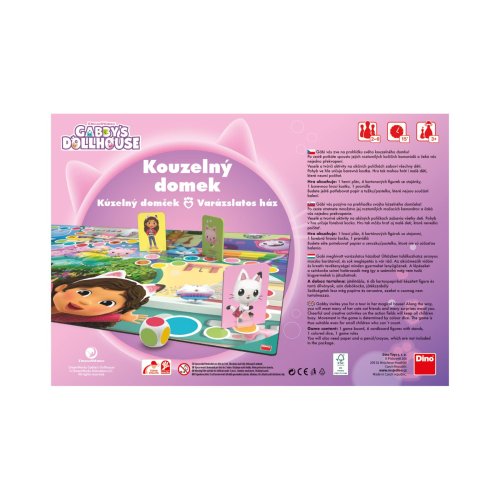 Gábi vás zve na prohlídku svého kouzelného domku. Po cestě potkáte spoustu jejích roztomilých kočičích kamarádů a čeká vás nejedno překvapení. Veselé a tvůrčí aktivity na akčních políčkách zabaví všechny děti. Pohyb ve hře určuje barevná kostka. Hru tak mohou hrát i malé děti, které neumí počítat. Hra obsahuje: 1 herní plán, 6 kartonových figurek se stojánky, 1 barevnou hrací kostku a pravidla Rozměr krabice: 33 x 23 x 3,5 cm Vhodné od 3 let